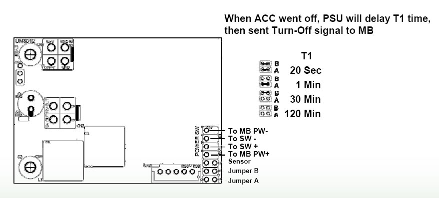 The Car-PC can be connected directly to the car battery (12V/24V). Based on ignition plus, the PC will start and shutdown.